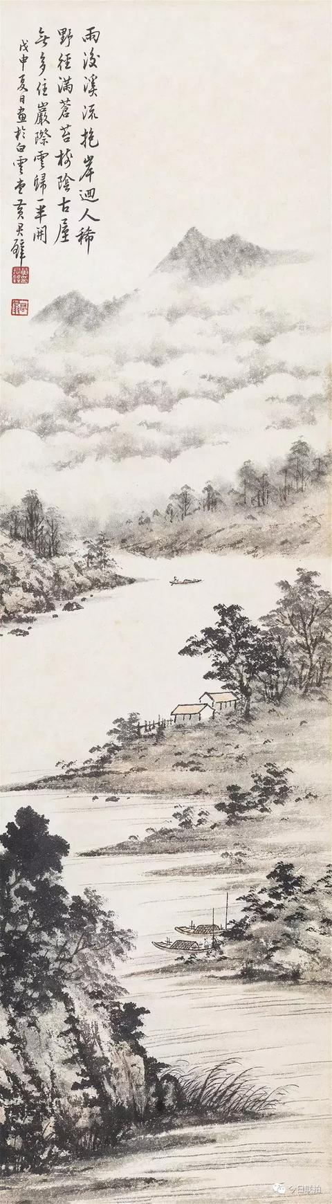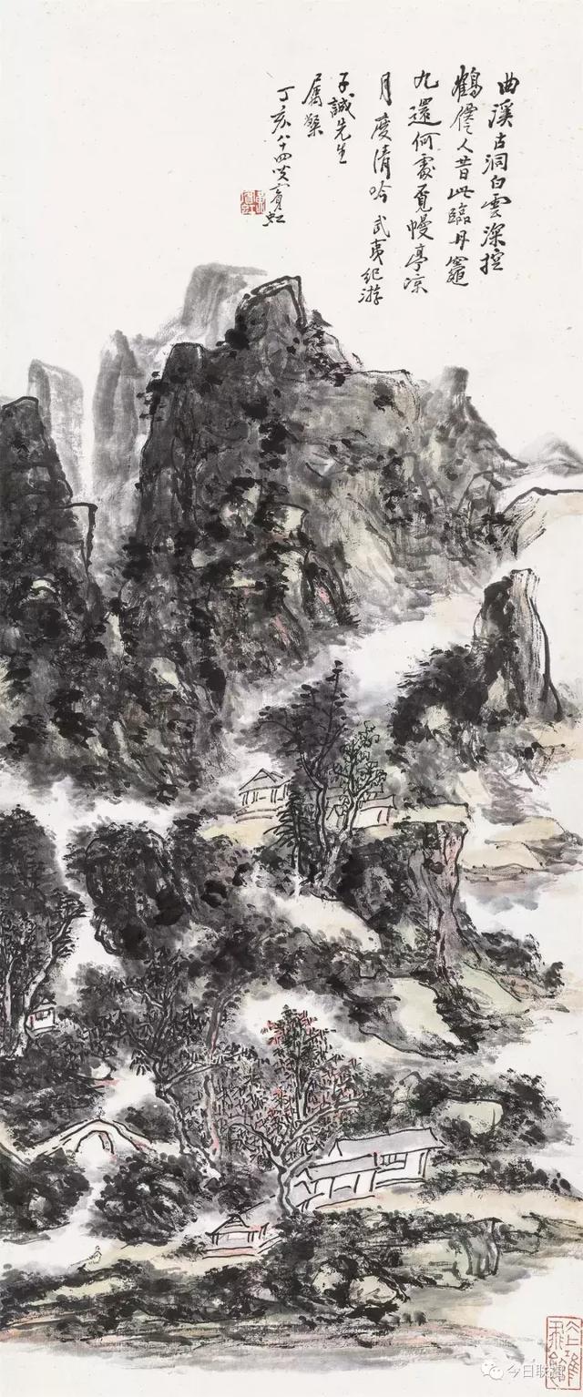 款识:雨后溪流抱岸迴,人稀野径满苍苔。榕阴古屋无多住,岩际云归一半开。戊申(1968年)夏日画于白云堂,黄君璧。