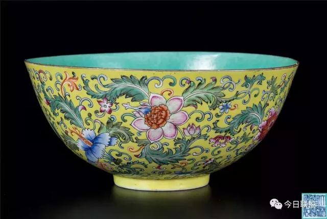 敞口,弧腹,圈足。碗内绿松石釉。外壁黄地绘各色粉彩花卉,色彩鲜艳华丽,质感细腻。此碗器型轻巧秀美,图案绘製精湛,布局有致,协调的色彩与精美纹饰浑然一体,令人赏心悦目。