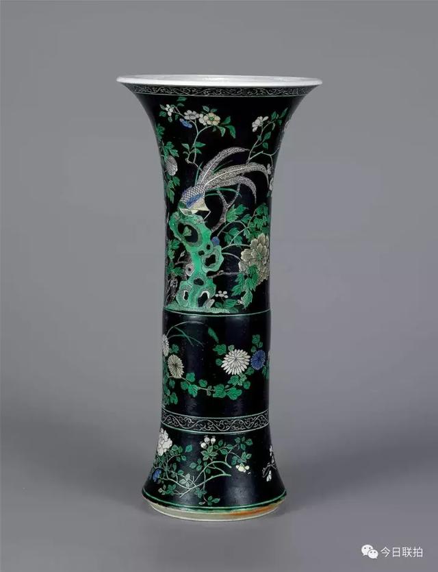 侈口,长直颈,直腹渐,足外撇,器形硕大挺拔,通体墨地,以赭、绿釉绘出花鸟图纹,色彩鲜艳和谐,构图自然疏朗,画功精细自然洒脱,整体气息富丽堂皇,华贵夺目。如此硕大器型的康熙本朝凤尾尊,实属难得。