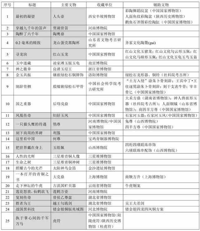 包括人头壶、陶鹰鼎、红山玉龙、良渚玉琮王、鸮尊、三星堆青铜人像、清明上河图、孩儿枕等,用国宝讲述中华文明的故事。