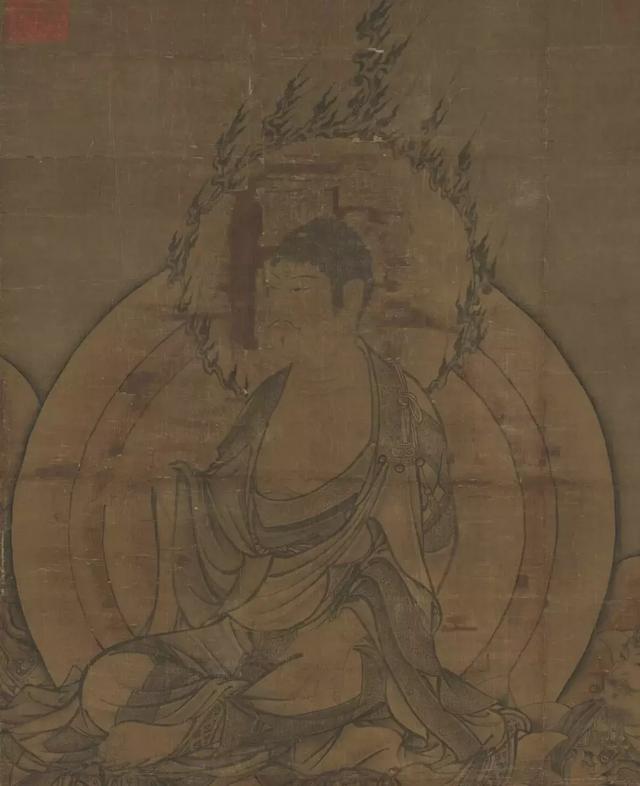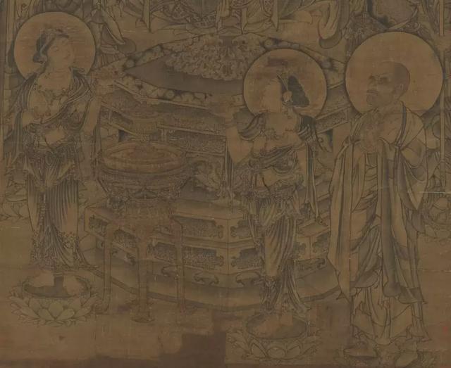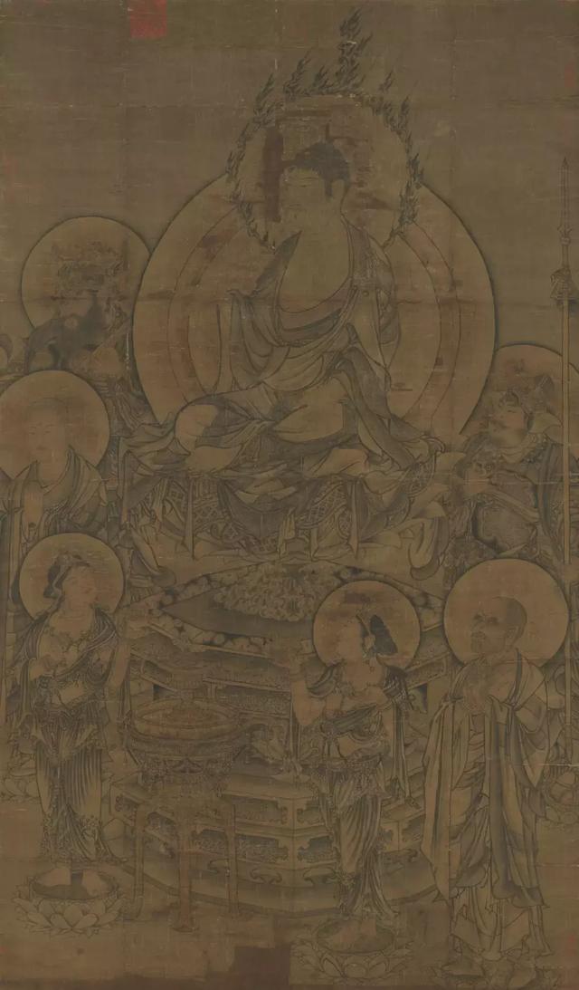 画中供养菩萨体态丰腴,衣纹沿线以墨晕染,仍见晚唐余风;而坐佛肉髻低平,髻底有一隆起物,具宋代佛像的特色,推测画成时代或在北宋早期。