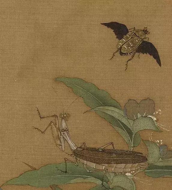 本幅画叶稍上,螳螂高举双臂,想要捕食金龟子,金龟子适时察觉,立即振翅飞起。螳螂扑了空,只好无奈地回首怅望。