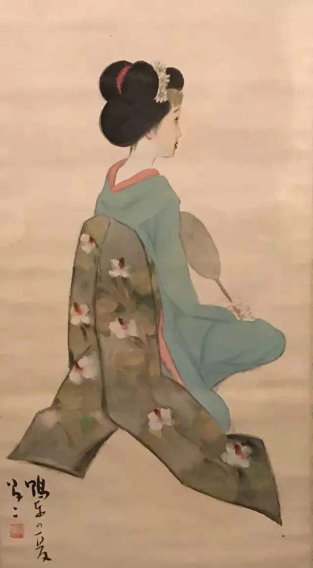 他的画里反差感很强,比如说这些季节是春天的画,虽然背景会有绽放的花、翩翩飞舞的蝴蝶,踏青等富有朝气的景象,人物穿戴着应景漂亮的和服,但一转向人物的表情,柔软的肢体语言以及安排妥当的纤纤玉指,总是有种难以琢磨的情感色彩,眼眸里带着心事,好似好多个林妹妹,“闲静时如姣花照水,行动处似弱柳扶风”。