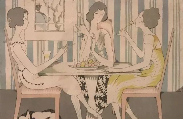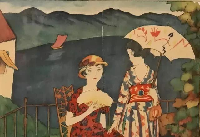 除了和服之外,梦二也对着洋装的女性有所描绘,她们穿着入时,举着酒杯谈天说地,具有非常明显的现代女性特质。