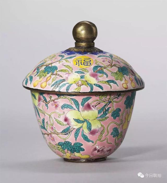 清雍正 铜胎画珐瑯粉红地万代福寿盖杯