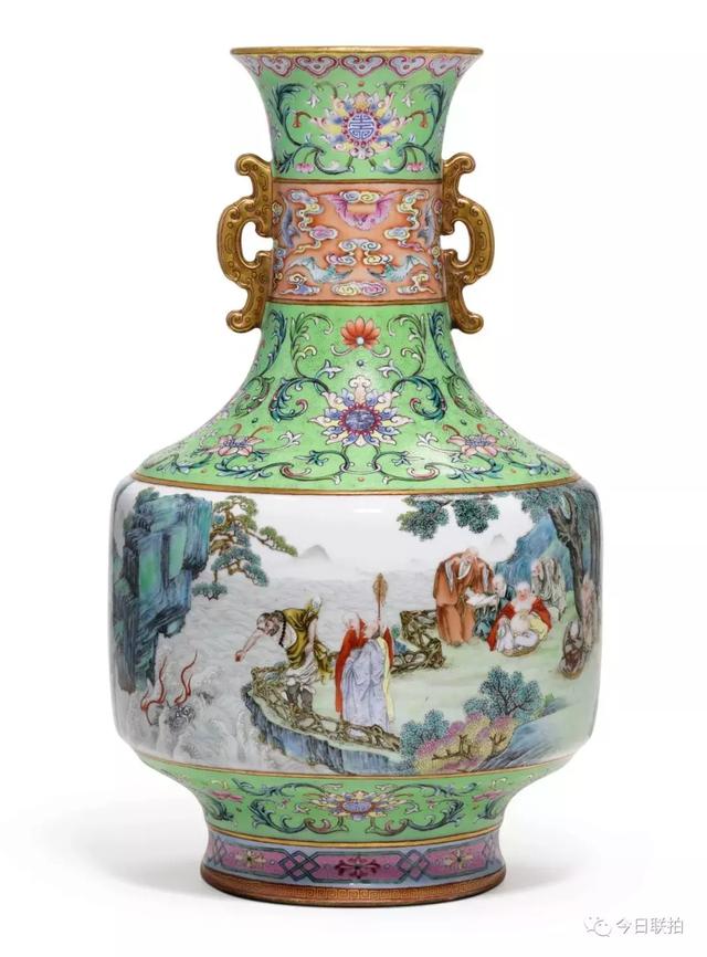 清乾隆 绿地粉彩轧道通景十八罗汉图双耳撇口瓶