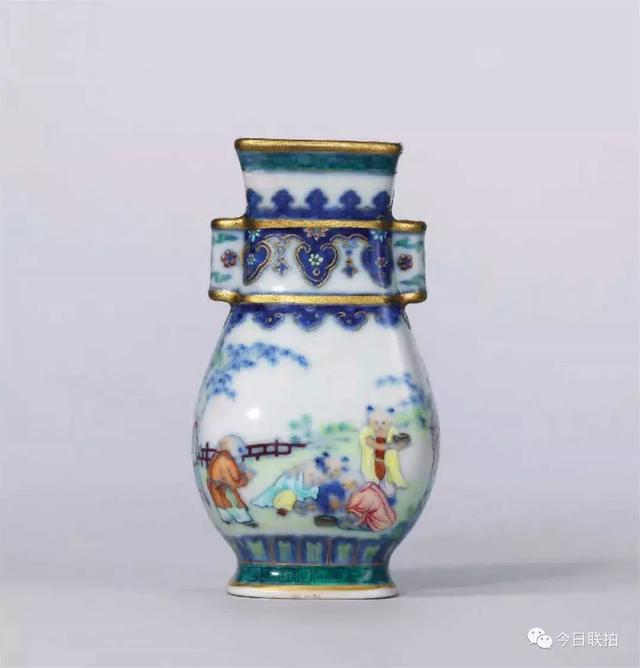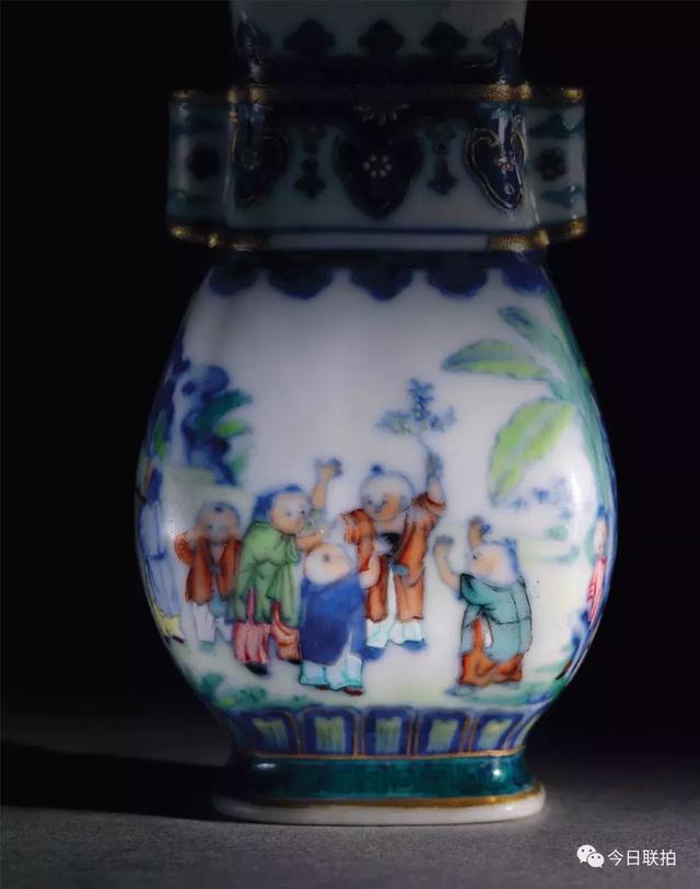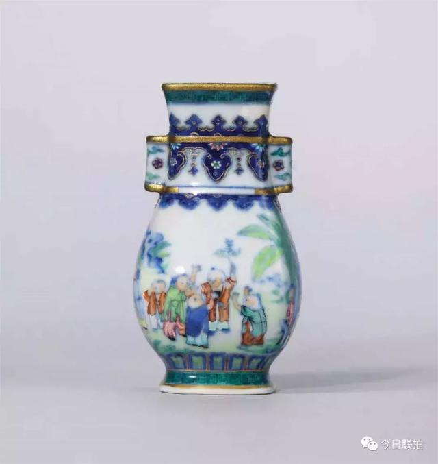 清乾隆 斗彩婴戏图双贯耳小方壶