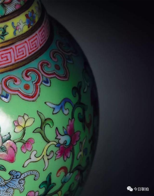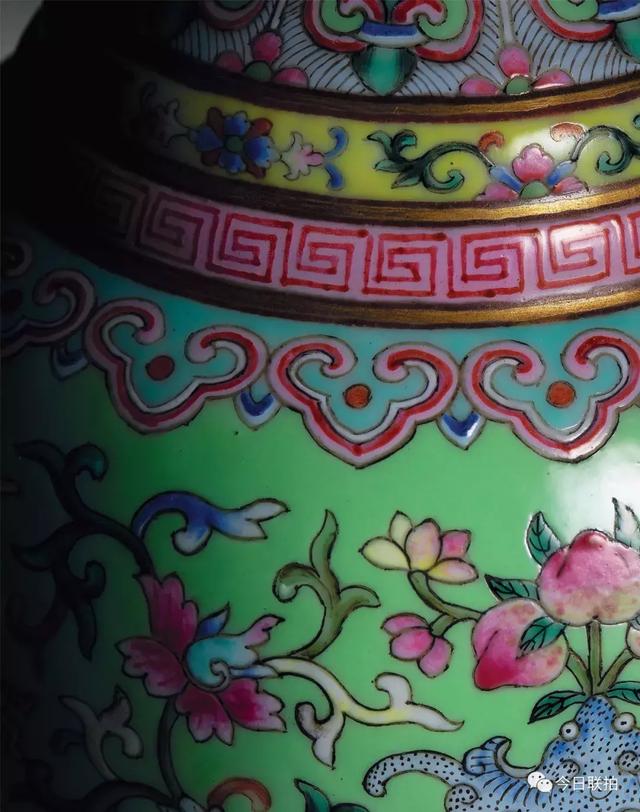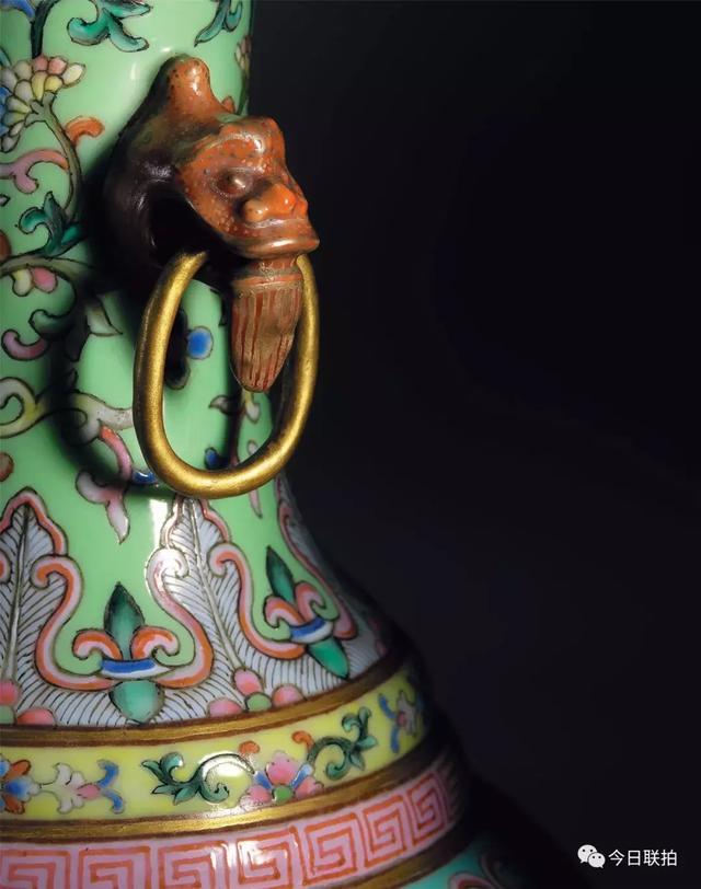 清嘉庆 绿地粉彩连年福寿纹双兽耳尊