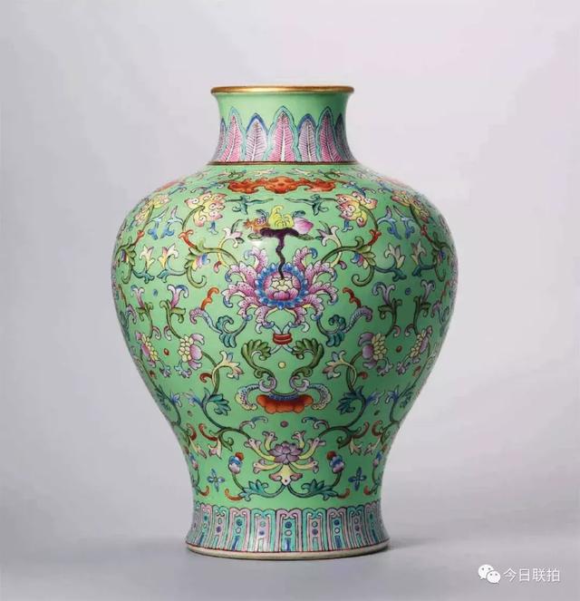 清乾隆 绿地粉彩缠枝莲三多纹梅瓶