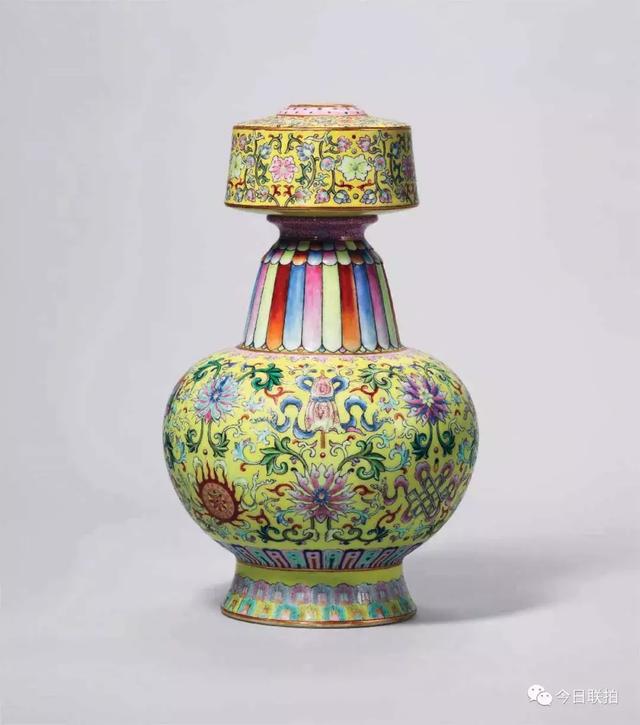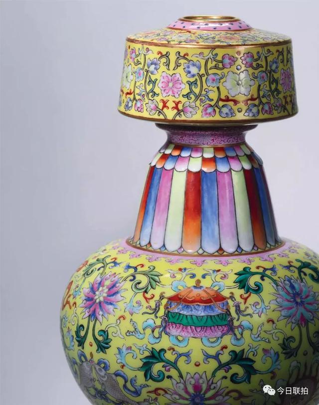 清乾隆 黄地粉彩莲托八吉祥纹贲巴瓶