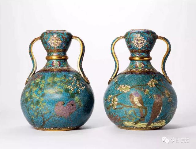 清乾隆 掐丝珐瑯花鸟图蒜头瓶一对