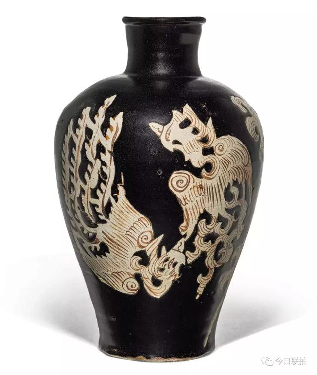 元 吉州窰黑釉剪纸剔凤凰纹瓶