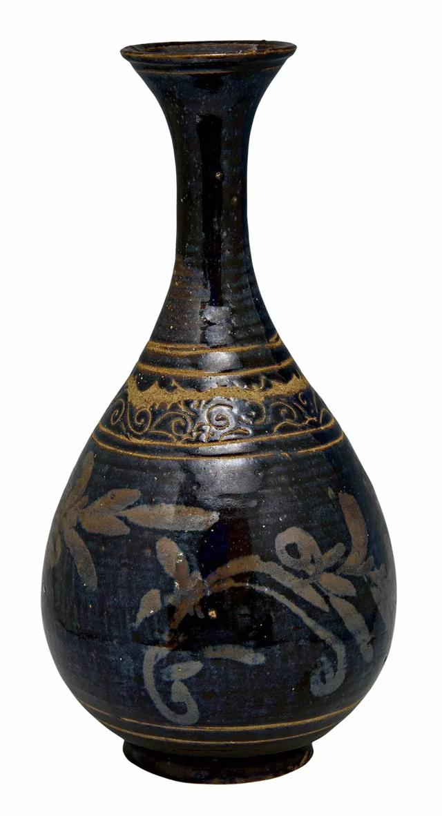 金磁州窑系黑釉铁绣花加剔刻纹玉壶春瓶