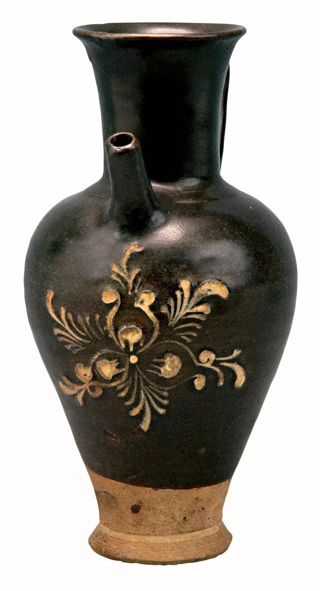 唐黄堡窑黑釉剔花填白花卉纹执壶