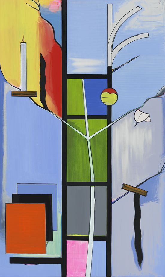 比如托马斯·塞比茨的布面油画《寓言风景934》(Allegorical Landscape 934),用笔直的黑色线条和雅致的纯色色块构成几个方形格子,代表德国包豪斯风格的建筑。简炼优雅的形象使作品充满现代绘画的形式美感。同时,画家将一枝枯树干穿插在方格子中间,荒诞的超现实组合暗示现代都市对树木的摧毁。此外,作品用最简炼的轮廓线表现虚拟的枯树干以及一只苹果和一片树叶,极简的形象有力地凸显已消失的树木的虚无感。作品整体上给人感觉寓意丰富而又优雅别致。