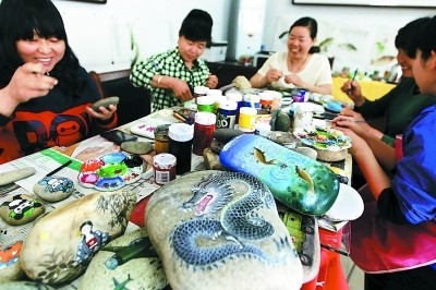 村民们在创作中也找到了新乐趣,还都有了“艺名”,成了“名人”,而且生活也有了变化。三婶说,画画上瘾,家里一没有客人,就想往画室跑。五婶更是痴迷,说现在对石头有点儿“魔怔”,看见一块儿石头就想着这形状适合画什么,去亲戚朋友家串个门儿,也瞄人家院子里的石头,瞧着好的就心里痒痒。