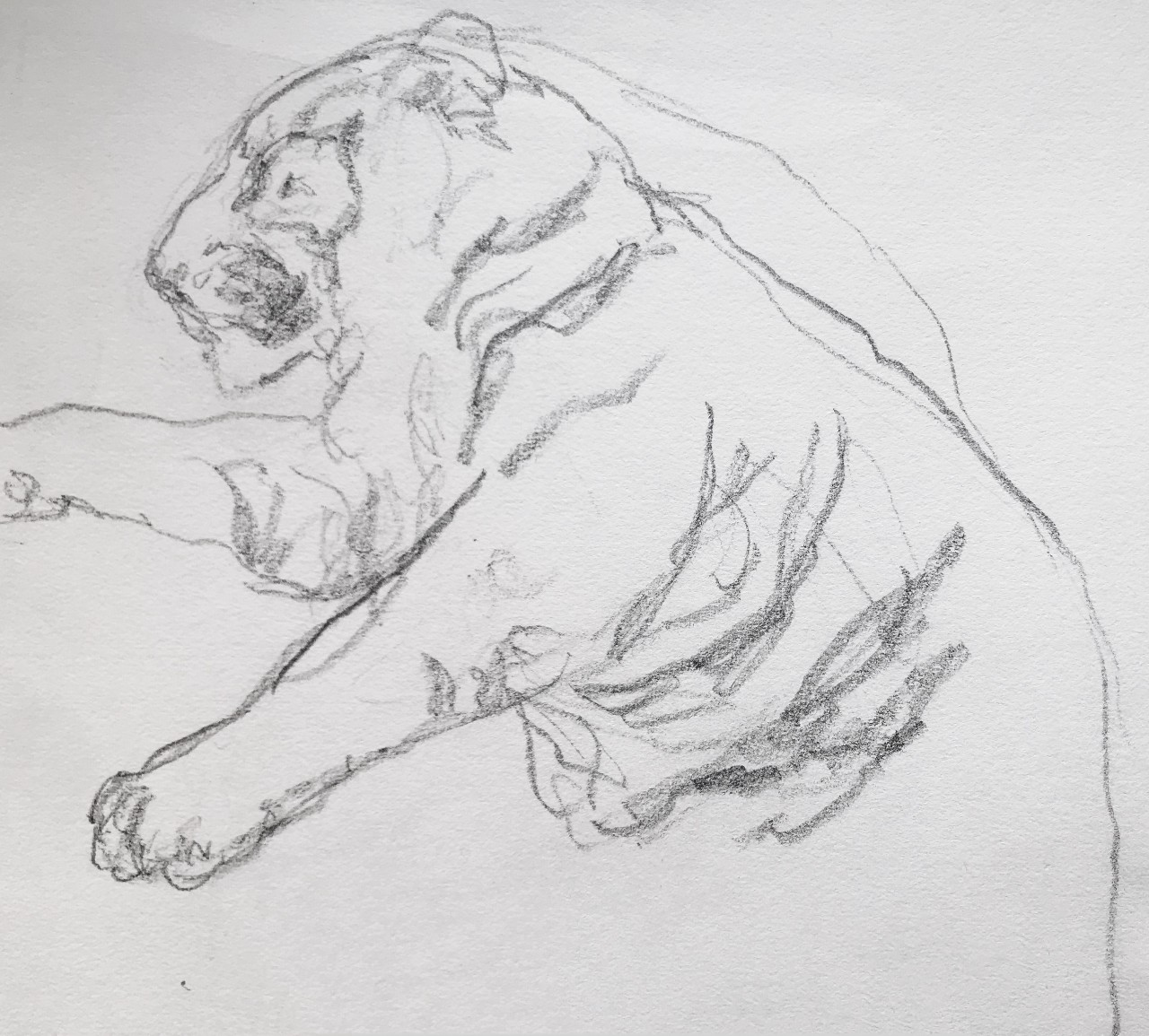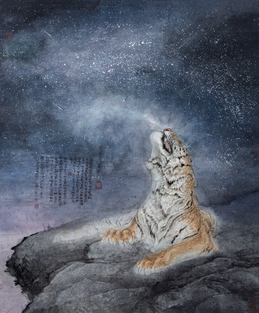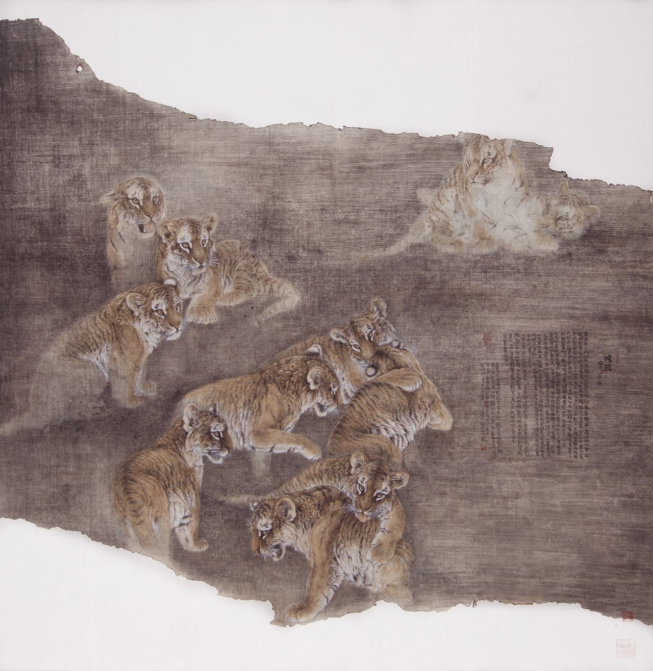 艺霖画虎工且尚意,虎亦有情。闲时小品写意经心,偶然失态。亦归宗大痴者,主重意者,绘狮虎善其意而见美,可称意趣为宗通明人绘画。以古法为规,且存新意!