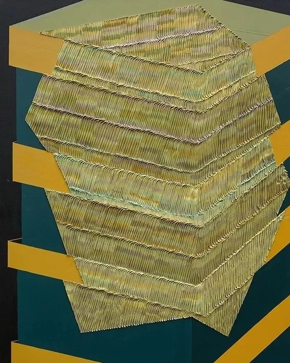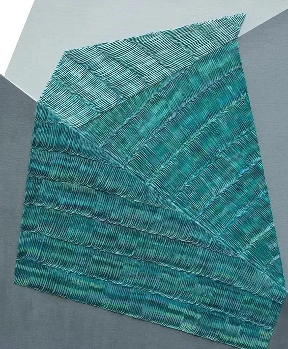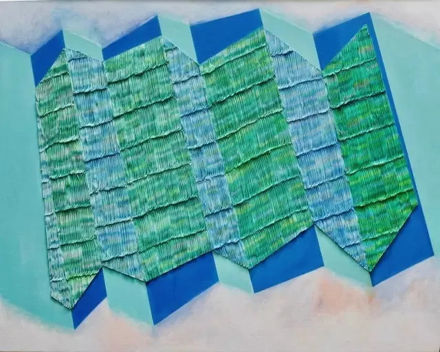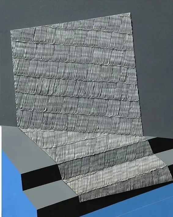 《神庙》色条所拥抱的是古希腊神庙的柱子。《人类文明》的创作理念来源于日常的书堆,色条所代表的既是书也是影。而整齐而有序的色条也是对现实具象的形的整理、归纳以及简化的过程。