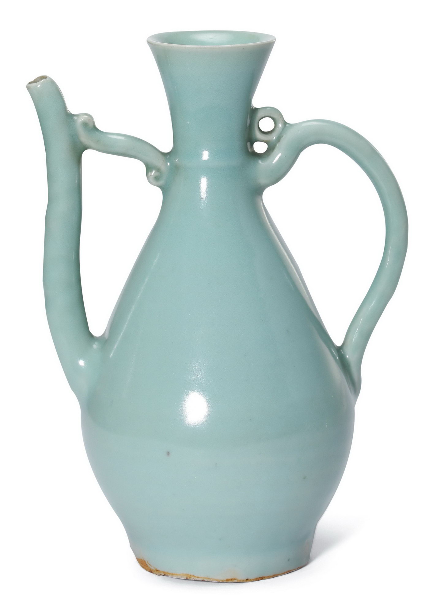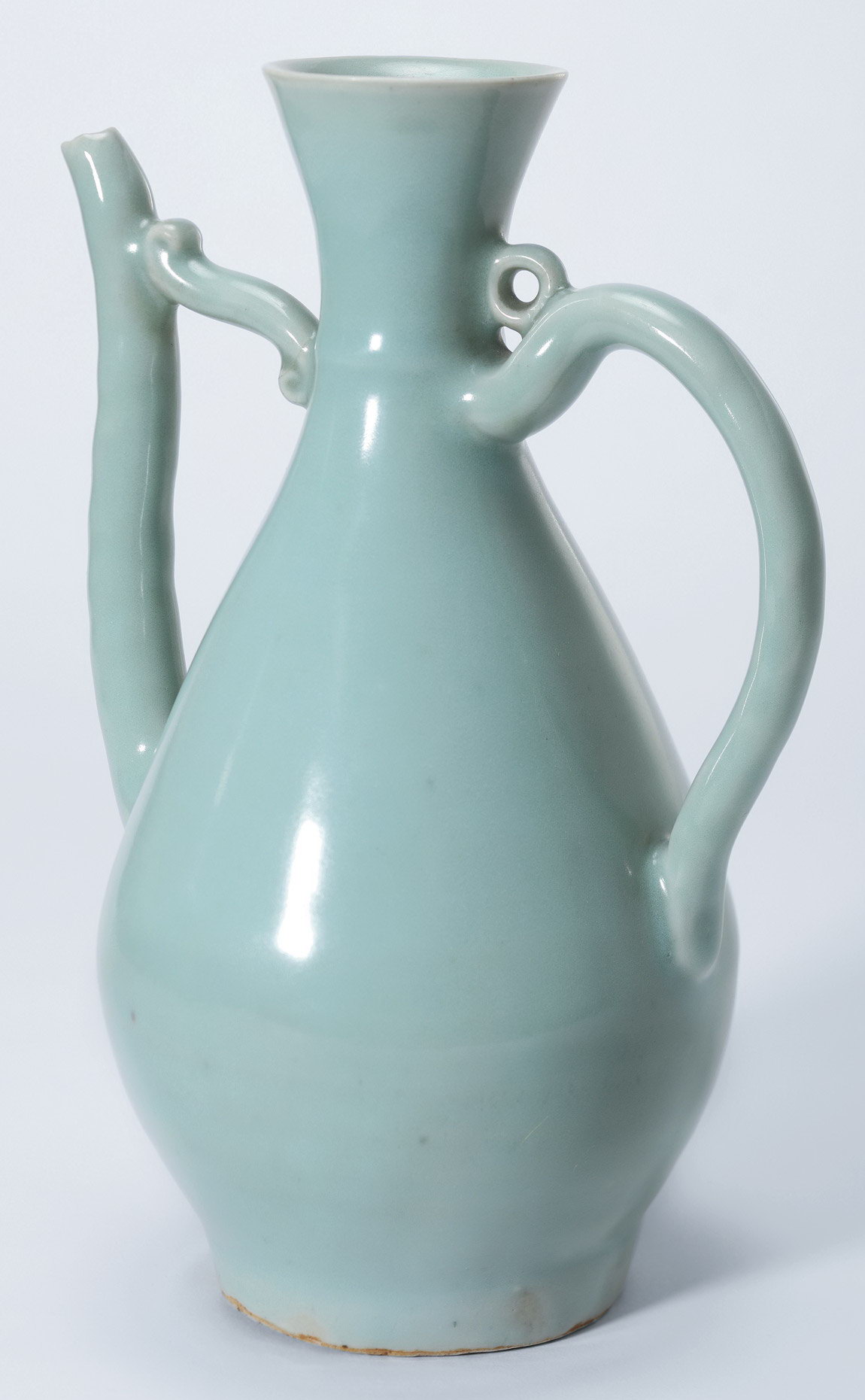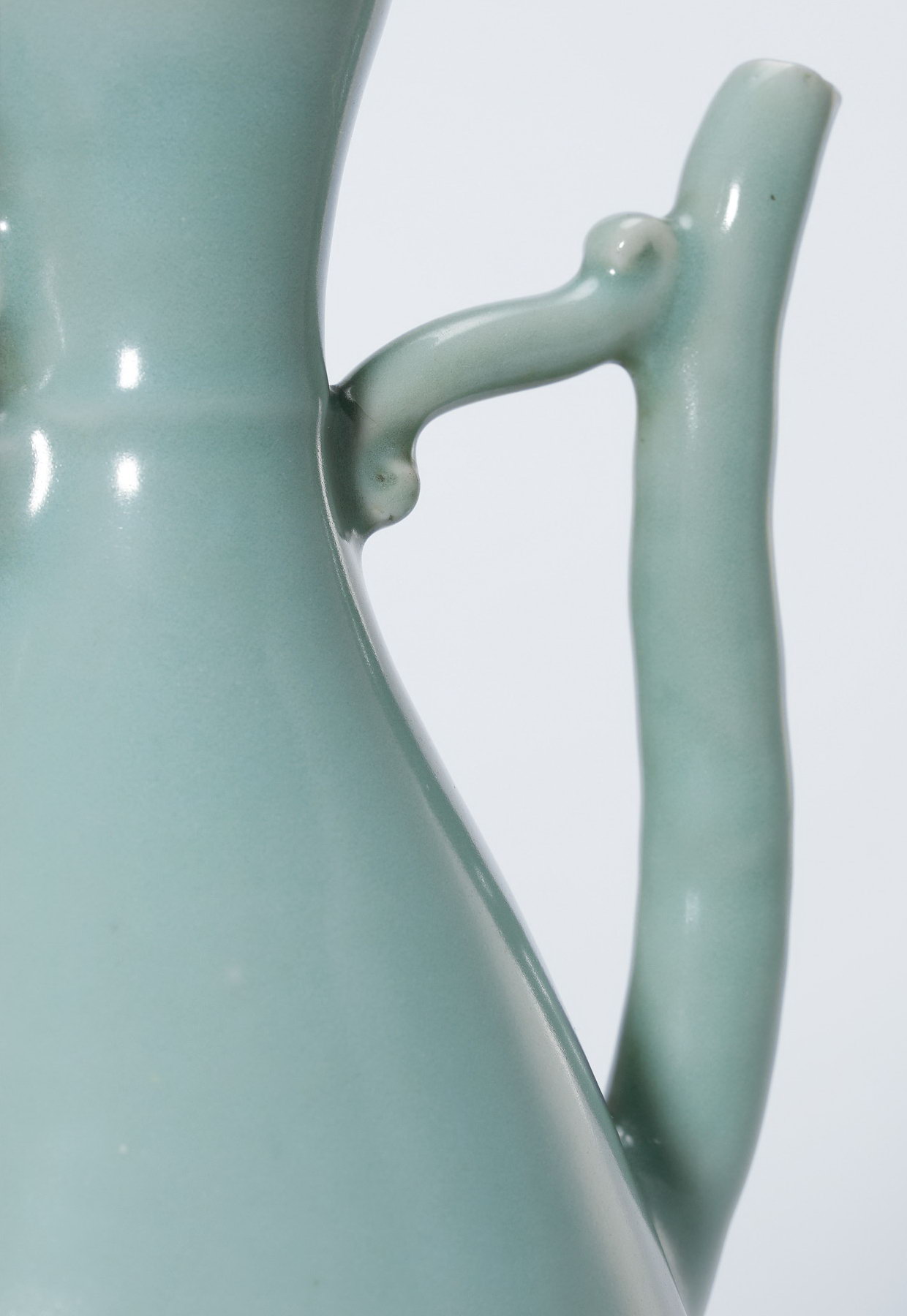 此壶内外皆施粉青釉,经多次施釉烧制,釉质厚润,宝光内敛。此类执壶器形源自金银器,龙泉窑多有制作,然而以元明之际所做居多。此件执壶釉色凝厚温润,下腹隐约可见旋坯痕迹,器形古拙可爱,颇有早期风骨。