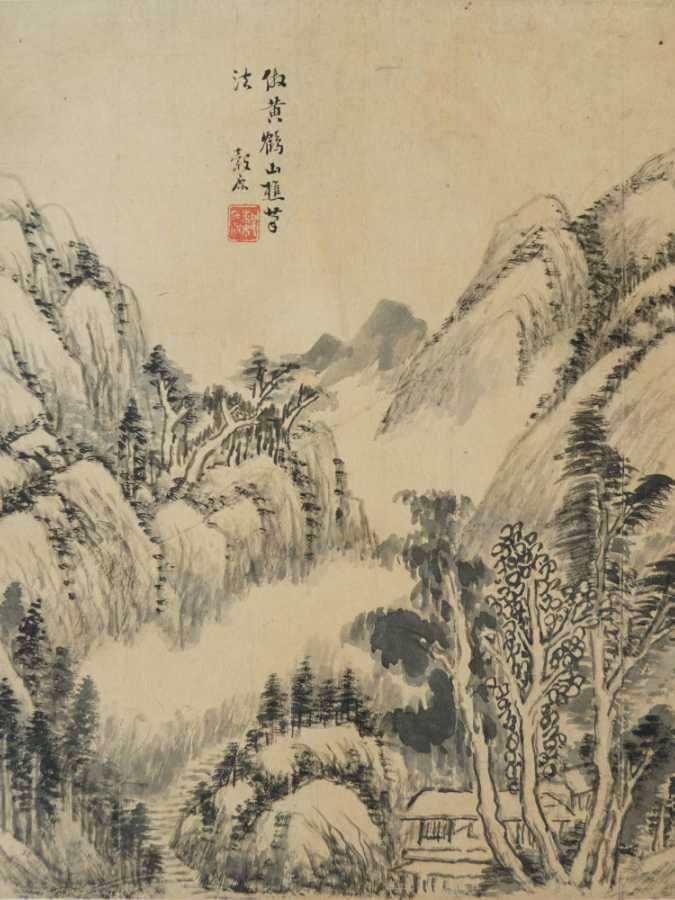 画中的远方是一带铅灰色的山脉,山下是明快的溪水。丘壑中的岩石杂树草木则与整个山峦浑然一体,其色调如同山涧清澈的深潭,虽然幽深,但潭底的一切都隐约可见。