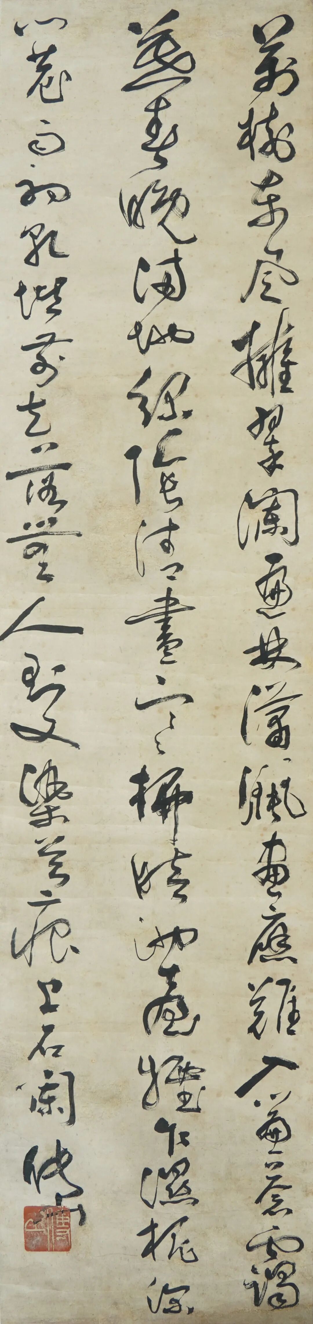 这情景颇似《斜江摇渡》画面中所描绘的。在画作的下方,几个微小的人物则是整幅画最引人入胜的部分。这些精彩的人物造型,虽然其比例小得几乎看不清五官,但通过人物的剪影与形态,一眼便可以看出鲜活的人物特征,年龄性格似乎也可一目了然。这些生动的形象仿佛是画面的眼睛,给整个作品平添了浓郁厚重的人文气息。