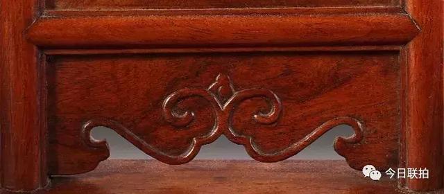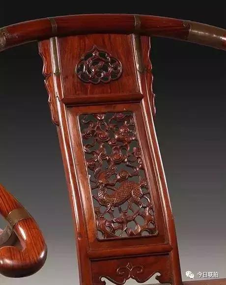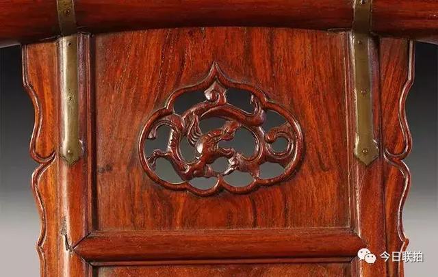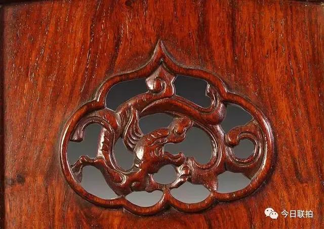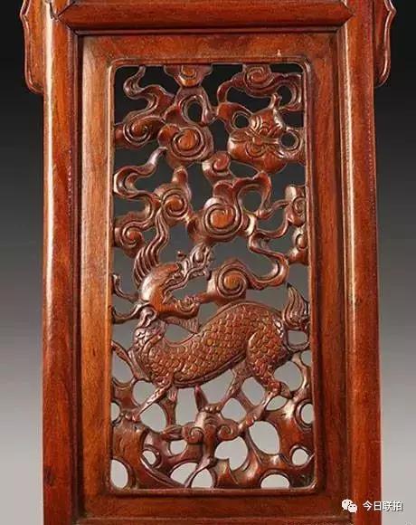 靠背板为攒框镶板的纵向形式,上为透雕螭纹,中为透雕麒麟纹,下为壶门亮脚。