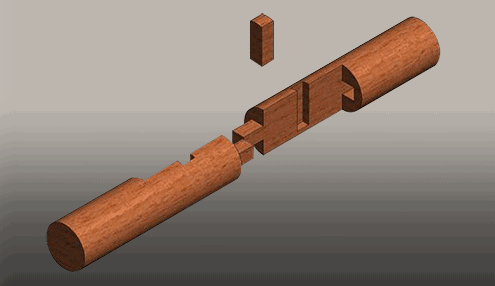 第二步:木质楔钉贯穿搭口中部的方孔,使椅圈不会左右松动。