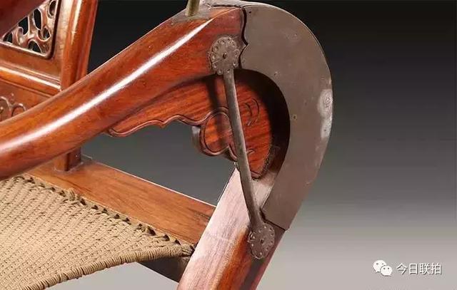 这件交椅主要构件的交接和弯转部位,以及部分榫卯结合处,都镶有铜饰件。