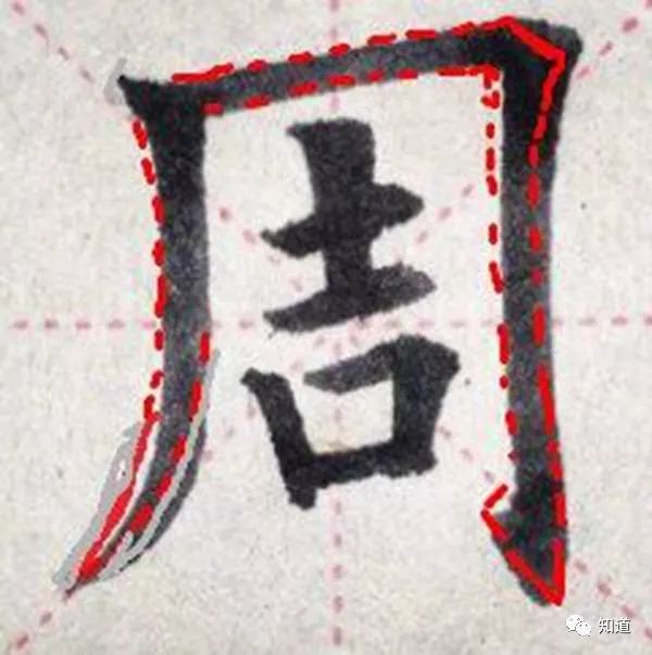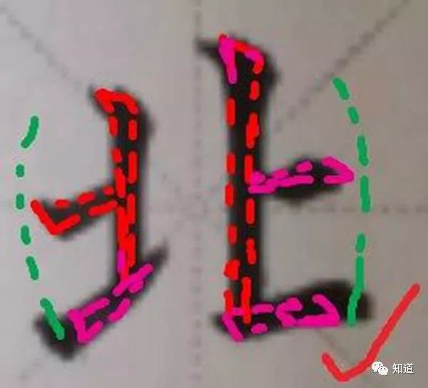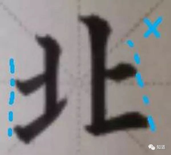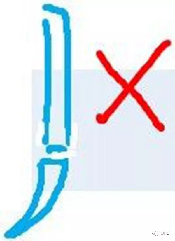 撇上部开始弯不够,下部弯过大!右竖不懂要弯度呼应!