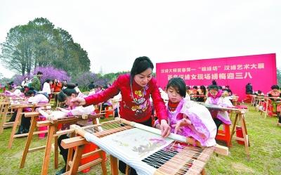 昨天是“三八”妇女节,东湖梅园大舞台前的草坪上一片锦绣风光:100位绣女在梅花下现场绣梅,通过展示精湛的汉绣技艺,为前来赏梅的女性游客增添一份节日的惊喜。这也是本届东湖梅花节武汉晚报文化周上演的压轴好戏。