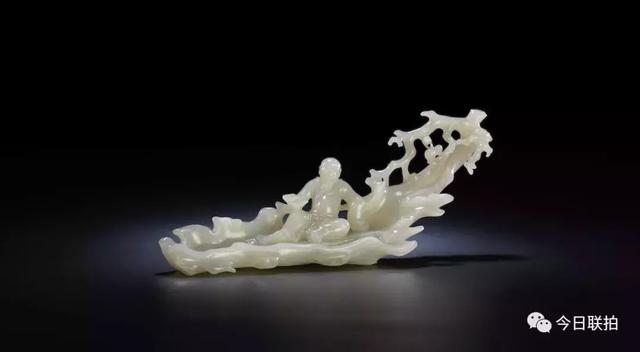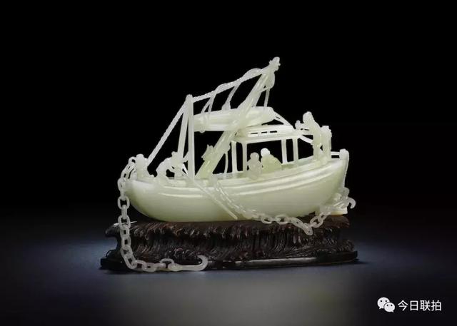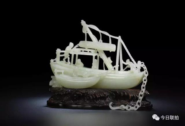 十八/十九世纪 白玉雕双舟渔乐图船形摆件