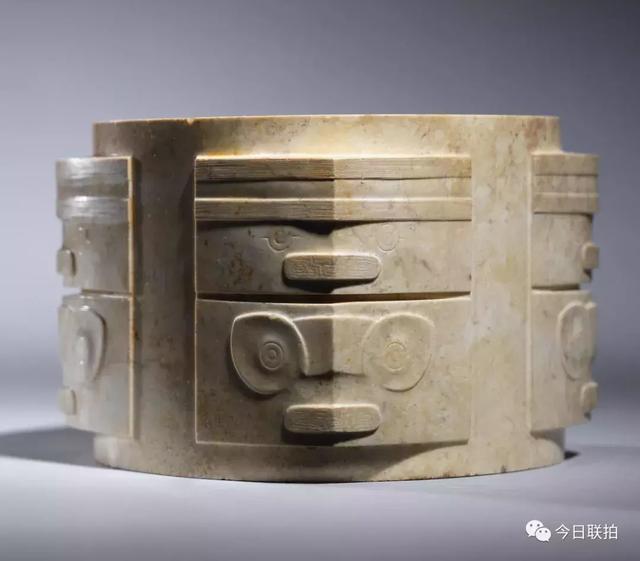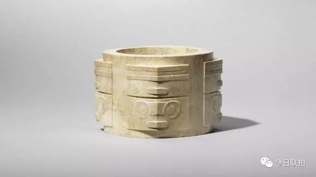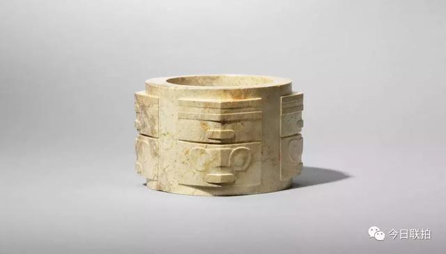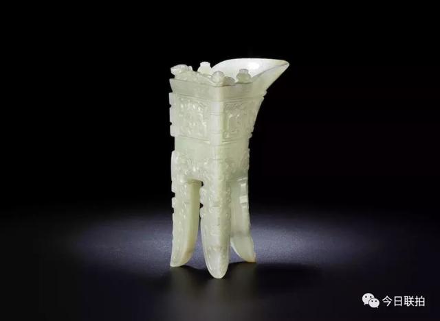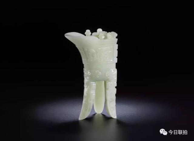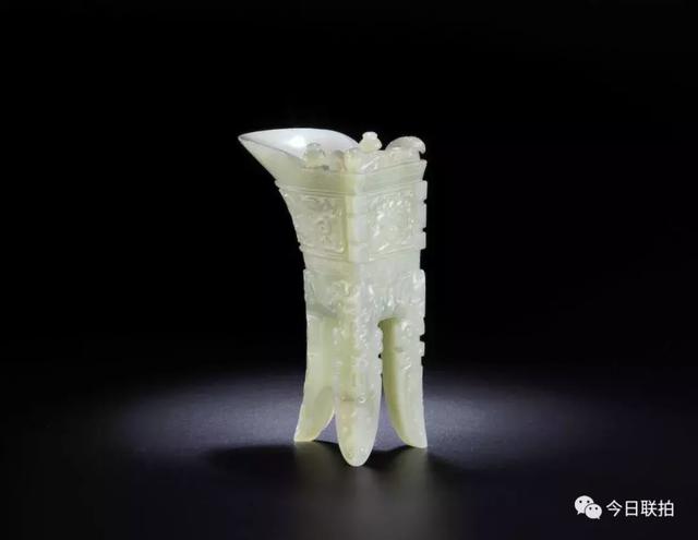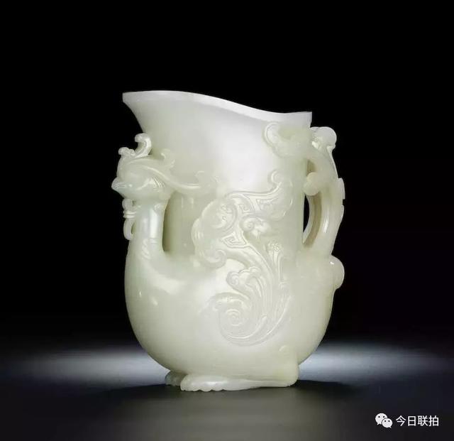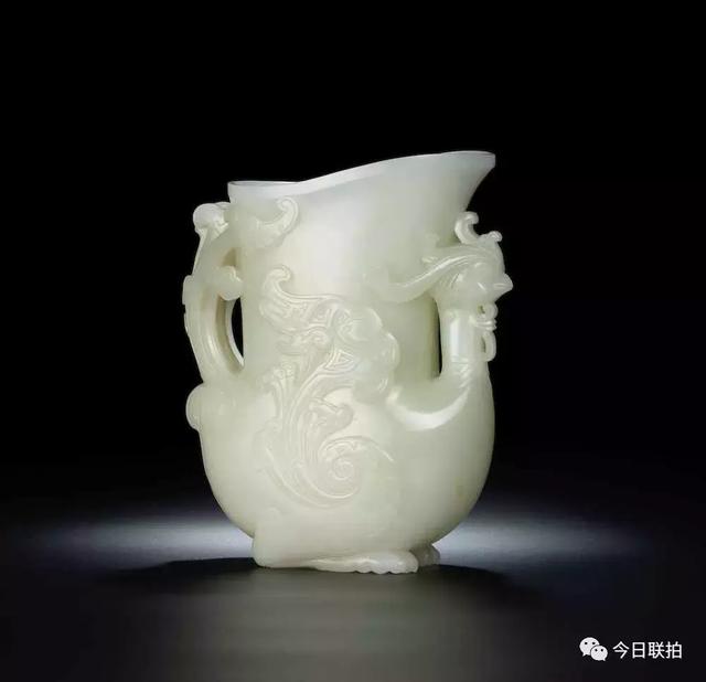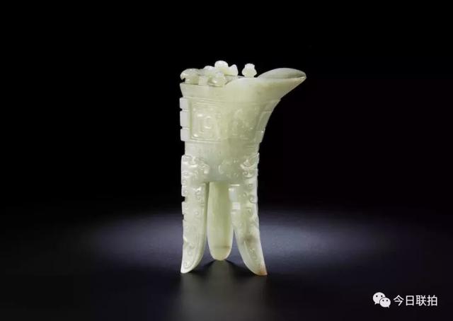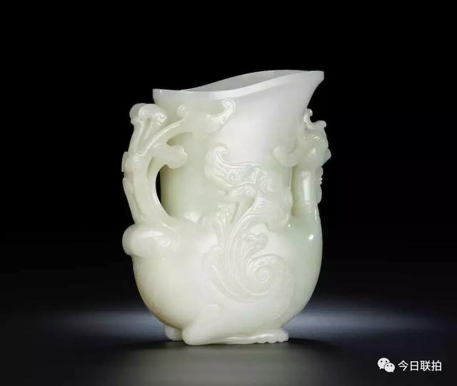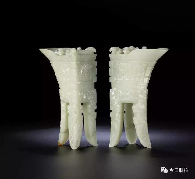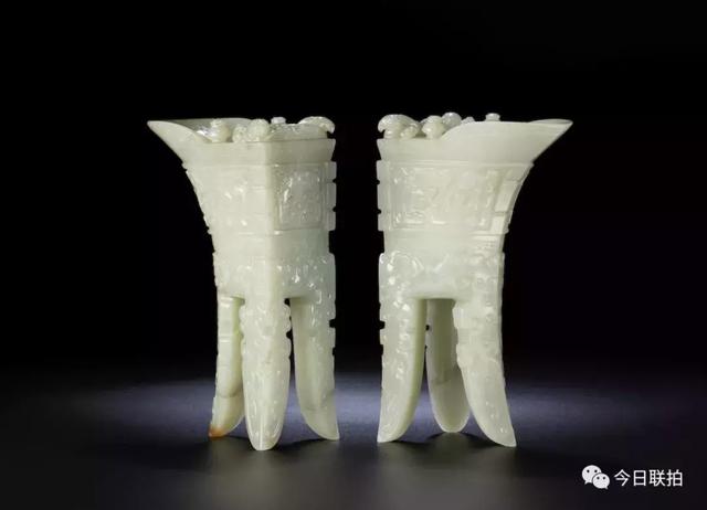 其中,玉器拍品尤为抢眼,一件清乾隆御制白玉夔凤纹觥是为此中重器,白玉略泛青,局部有烤色。仿古彝器,扁筒式,口微敞,器形修长,器身前后分别圆雕及镂雕凤凰首尾,双目圆睁,顶戴羽冠,昂首仰胸,气宇轩昂,凤尾成如意形羽状,卷曲上扬,凤凰双翼浮雕于觥腹两侧,作仿古夔龙纹,器底雕凤足,生动写实又不失古雅之风。另有一对清乾隆 青白玉双合爵和良渚文化 神人兽面纹玉琮同样颇受关注。