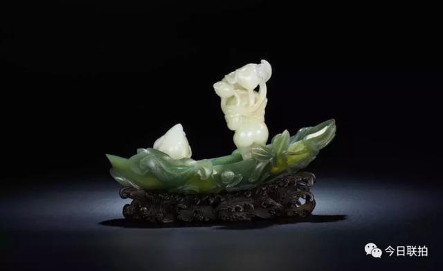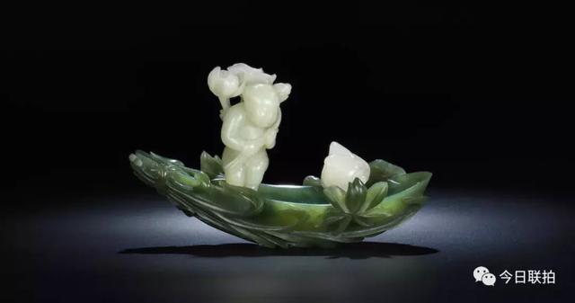 清乾隆 碧玉嵌白玉雕莲童乘槎摆件