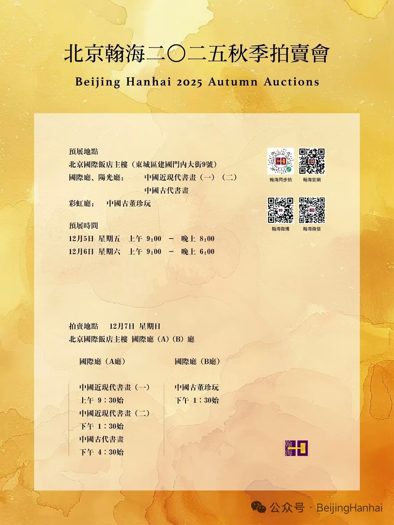 翰海四季· 87期拍卖会定于3月12-15日在北京千禧大酒店举行,12-13日预展,14-15日拍卖。作为翰海2015开年首场艺术品拍卖会,此次87期四季拍卖将推出中国书画-宝聚斋专场,近现代书画、古代书画、当代书画专场,佛说四季-金铜佛像、名酒·家具、古董珍玩共7个专场,近2100件拍品。