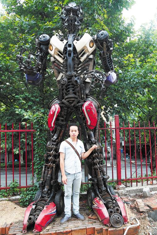 长沙晚报讯(记者 胡媛媛) 如果你是机械玩具控,那么变形金刚、机器人一定都是心头爱,可是你见过用汽车废弃零件、旧家电甚至煤气罐、消防栓制成的机器玩偶吗?在芙蓉区朝阳街道曙光社区居民张忠刚手中,这些都不在话下,身为85后的他,小到巴掌长的机械动物,大到4米高的变形金刚,都能捣鼓而出,而废弃素材的采用更让他的作品倍添“环保范”。