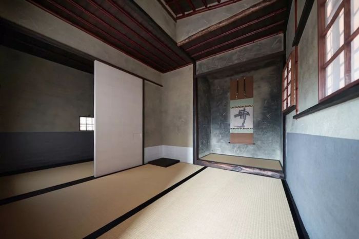 在这一部分的展示中,观众可以脱下鞋子,踩在石头上,弯腰从低矮的门中进入茶室《待庵》,跪坐在榻榻米上,体验安土桃山时代贵族饮茶的空间。