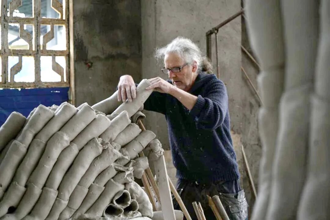 展览展出的作品中可以看到,艺术家将手工压制而成的管状泥胚彼此堆叠,泥胚管相互挤压,艺术家对挤压下的泥胚再次塑形。泥胚自身的重力和身体给它的外力彼此抗衡,这种力的对抗会在塑造过程和干燥过程‘中带来意想不到的结果,有时泥胚会断裂或坍塌,艺术家便根据这种状态继续塑造。这一过程或许会让人想到中国太极拳运动中的推手。对手双方手臂贴连,在运动中反复试探接受对方的力回应对方的力,寻求对方力道的奕破之点。与之相应,在卡瓦斯博的创作过程中,是身体之力与物质之力的彼此接受与回应,也是人类能量与自然能量的彼此接受与回应,相互探寻各自未知的无限可能。
