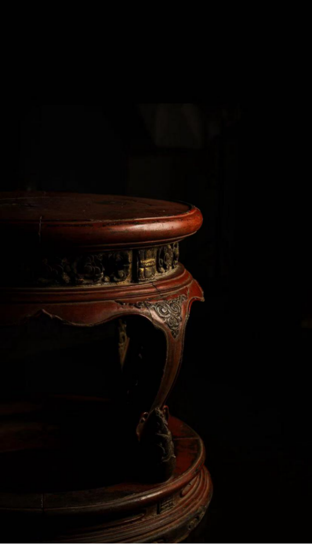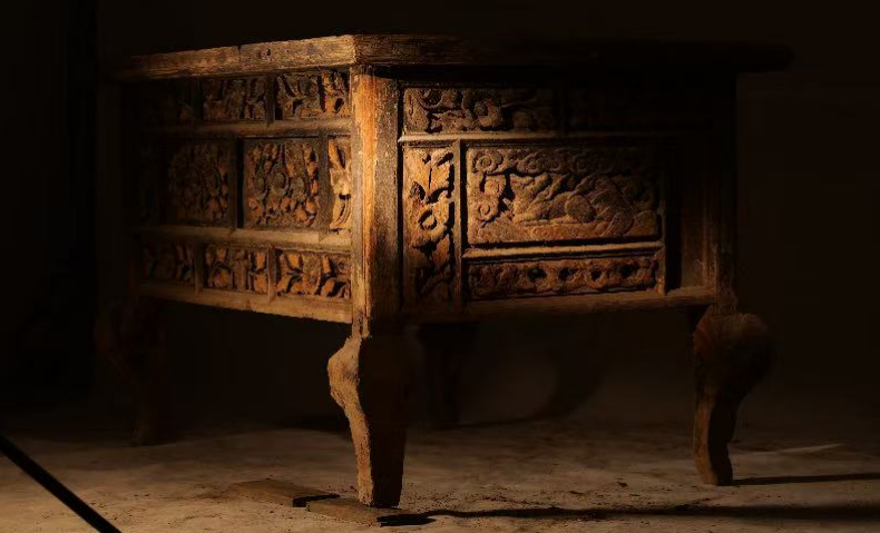 几面周边起拦水线,冰盘沿,有束腰。齐牙条,浮雕双螭龙遥遥相对,缀卷草纹。腿子肩部雕兽面,毛发飞扬,双目炯炯,栩栩如生。三弯腿下雕虎爪足,上下呼应,匠心独运。