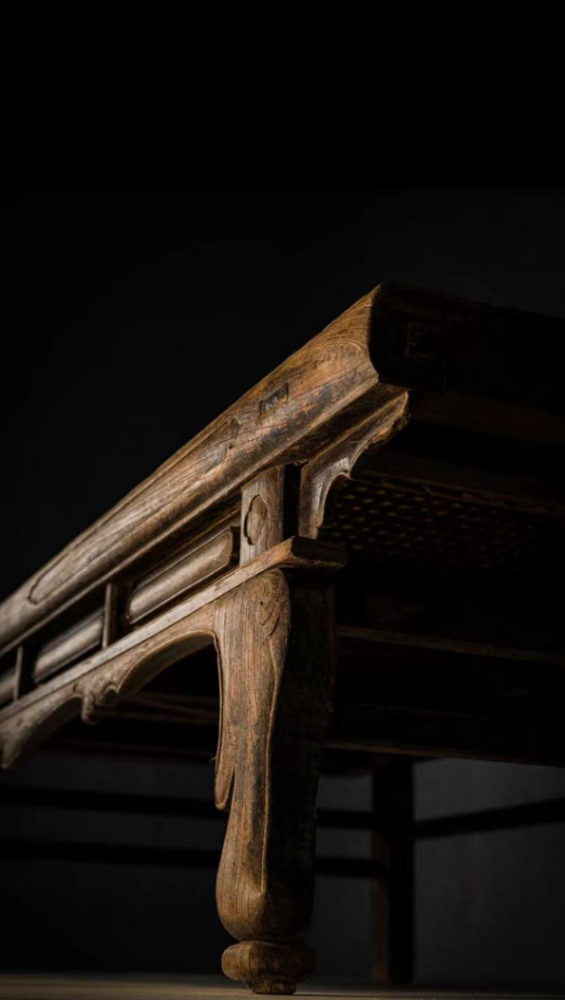 此案平头案样式,夹头榫结构。案面攒框镶板心,冰盘边沿,面下牙条与云纹牙头一木连作,牙条及云纹牙头边沿起阳线。方才腿足,两边起混面压窄边线,前后腿间装方材双横枨。画案造型简洁优雅,做工见究,设计巧妙。案面以木栓栓于横枨,拉开木栓,案面及腿均可拆卸,方便携带,为古人行军、郊游所用,故名。