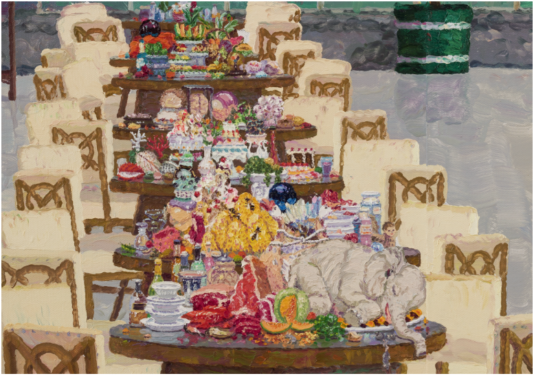 张颖的创作方式是将现实与虚构结合。她通过三维建模软件对神话形象和大理石纹理进行重新造型和图像重制,构建出一个虚拟场景,然后再将其转化为画布上的绘画语言。这一过程使现实与虚构的边界变得模糊。