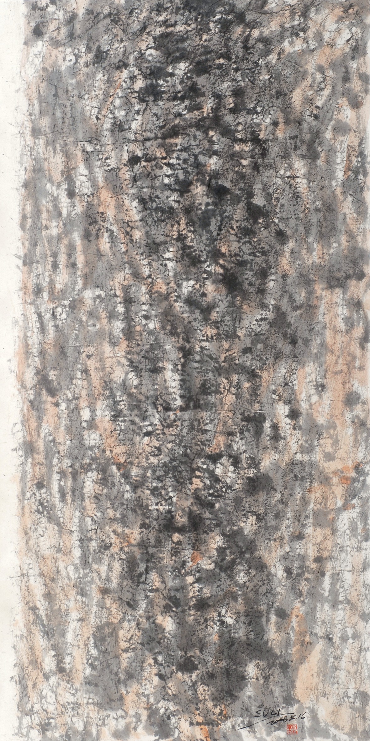 宿曾问我寻看一副照片,那是美国抽象表现主义画家,雕塑家德库宁系着工作时用的腰布,手握大正欲再次冲向画布的一瞬间,犹然一头狂暴的公牛。今天我也看到宿围着一块腰布,但却在那里小心翼翼地运笔,谁能说他不是另一头牛呢?尽管乍看上去笔下躺着的是一片沉静。