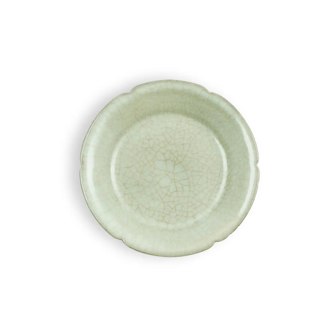 本品工艺精细,布局疏朗,不仅器形优美简约,且所施粉青釉亦清妍淡雅,映衬着釉下所刻纹样,自然清新。此件折沿碗不独以器形优雅,色调纯美取胜,更注重总体协调,其制作之精细讲究由此可见一斑。