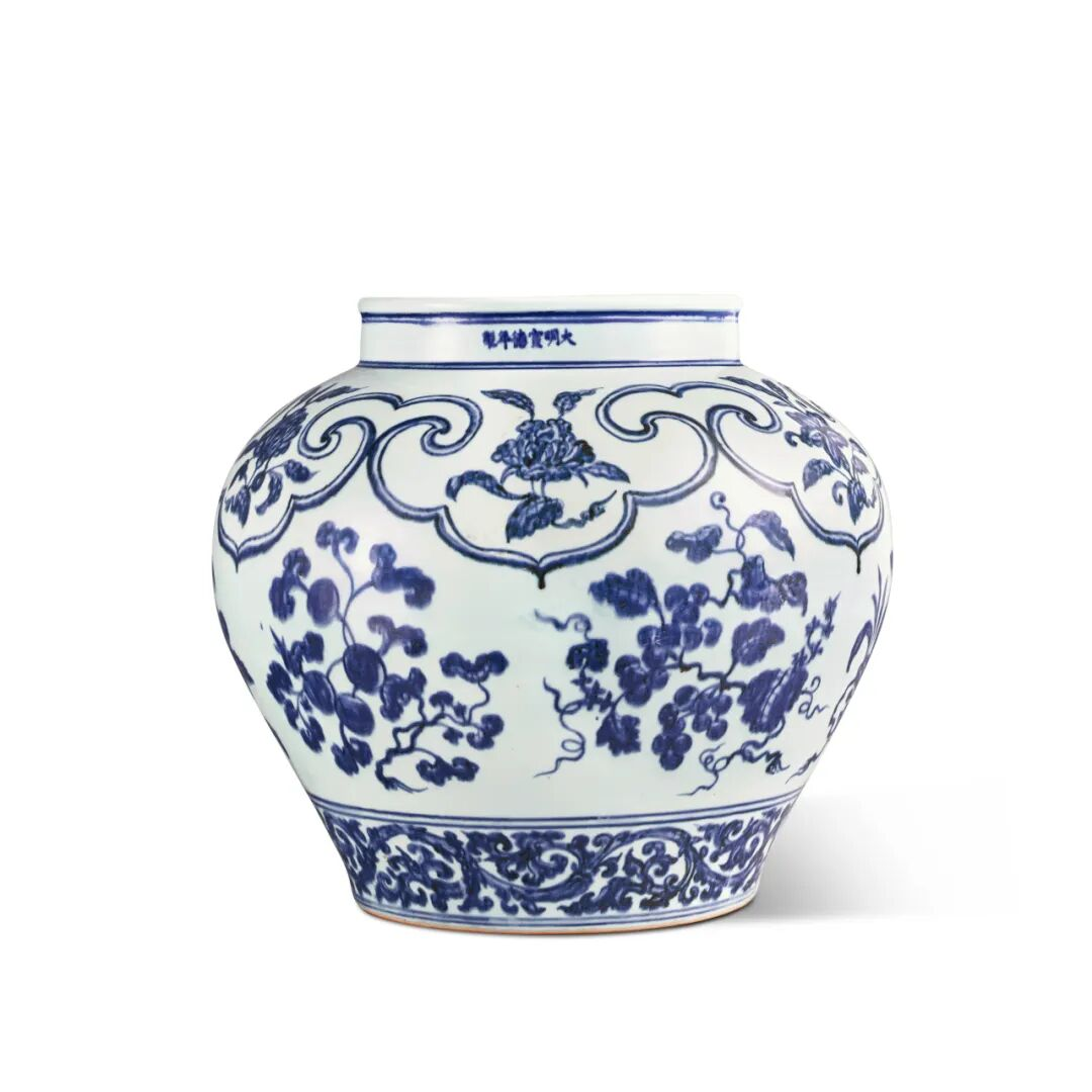 本品传承有序,青花发色明快,四字楷书款“嘉靖年制”,从青花发色和款识写法推断,或为嘉靖早期之物。嘉靖一朝作品丰富,样式繁多,如本品这样形制高贵且特殊的耳杯甚是少见。此件器物毫不吝惜工本,海棠式杯口和饰于两侧的凤耳都增加了制作的难度和烧造的风险。杯内壁白釉洁净细润,外壁基本满画工,修胎细致,两耳塑形准确,凤鸟描绘传神,底足干净利落,重心偏下,沉稳敦实。之前的拥有者克拉克伉俪和约翰·斯帕克斯都是世界顶级收藏家,都曾购入此杯也证明必是路分不凡之物。