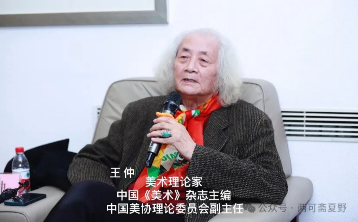 呃我还在讲的就是这个三个特色嘛,新的精神之外,(夏野)他有三个特色,就是一个是这个民族特色,第二是这个时代特色,第三是个人特色,这三个特色(夏野)他都有了,这个民族特色呢,显然是从传统绘画中衍变出来的,这个我刚才讲,(夏野)他虽然借用一些西方,西方的这个画法拿来为我所用,是和你结合,结合什么呢,用一下就可以丰富我的绘画,但最后它是民族特色。第二点时代特色,夏野他那个画时代特色很强,我当时跟他讲,在那个元明清那些人画那些树,勾过以后它不会用大片的墨,绝对没有大片的墨,因为这个,尤其这个南宋画家,文人画家反对有大片的墨,因为文人画最早就很文雅,淡淡的画,就是吴昌硕的画呢,是当时很多人反对的,但是吴昌硕是以文人画的这个创造者之一,(吴昌硕)他创造一个新的东西,(夏野)他那个画,时代特色也是很明显的。个人特色,个人特色更明显,有这三个特色,绘画还是能站得住的。但是呢(夏野)你这个年龄也不大不小,当然对画家来讲还算年轻,我觉得下边啊就在这基础上再试验下去,试验下去我觉得(夏野)他再加点传统,把传统提高一点,提多一点 嗯,刚才王仲(美术评论家)说你再放一点,我觉得放也差不多了,哈哈哈这放也差不多了,下面收一点,收一点研究一点传统,把传统多加一点,我觉得(夏野)你的绘画将来还是相当了不起,祝愿你(夏野)呢,百尺竿头再进一步!!!