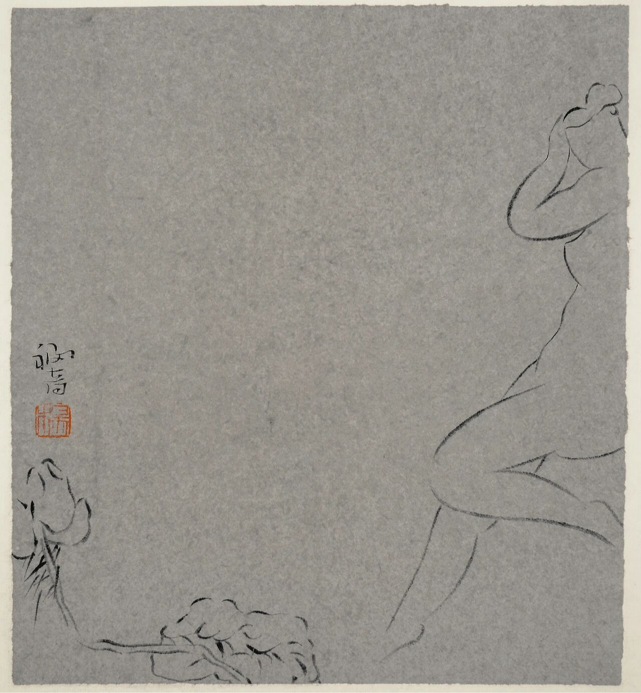 构图朴拙而颇具雅趣。一位高士右手执竿垂钓,却凝神注目于左手所握之书。钓絲下面,几尾小鱼在自在游弋。题款是:人适忘鱼,鱼适忘水。