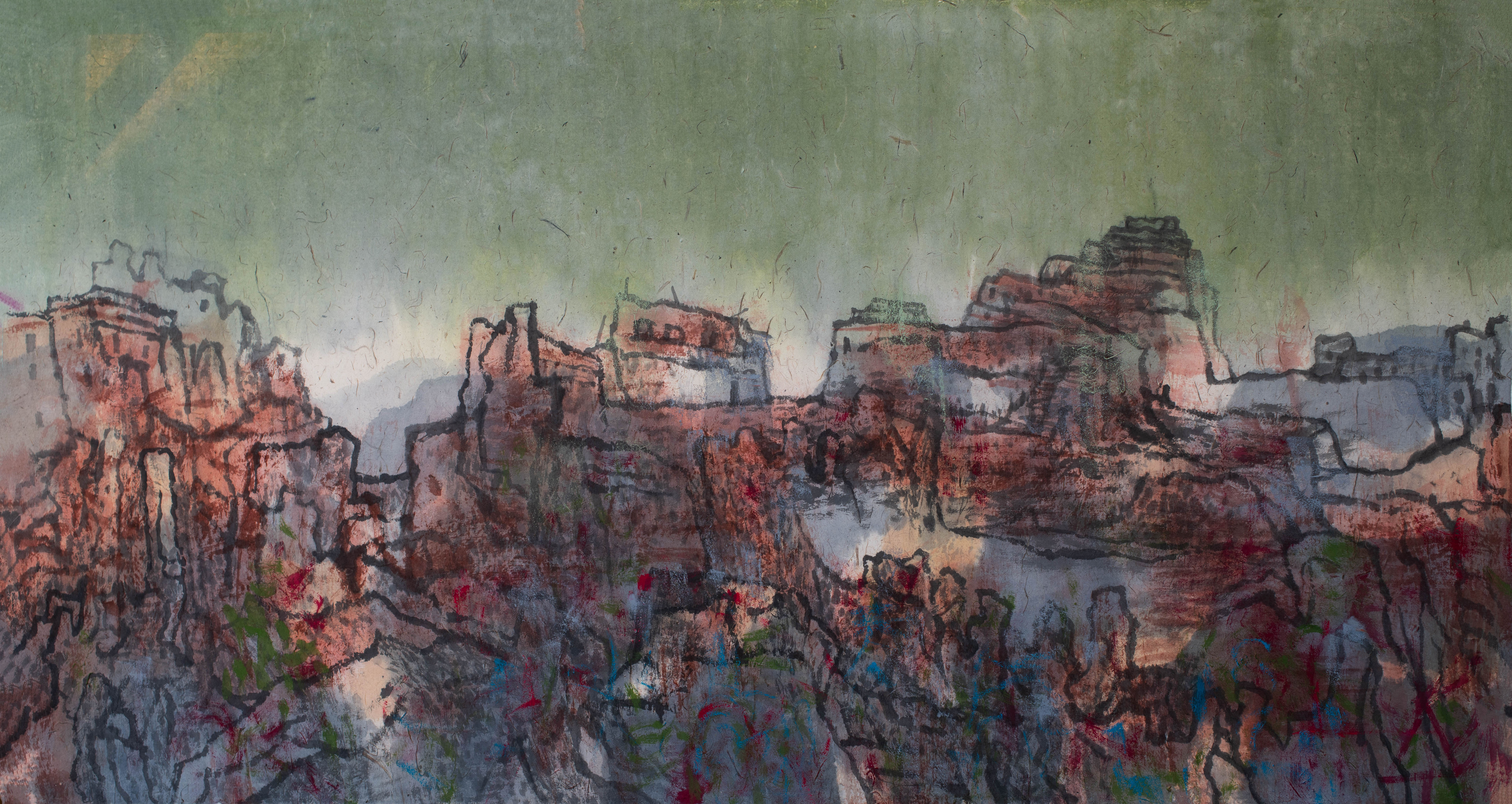 沈爱其自1960年代开始从事此风格的创作,便始终坚持对宇宙万物所思所悟的表达,在追求奔放不羁之气势的同时,略加点缀较为具象的山石树木,限定观者的空间想象,增强关联性结构和整体的视觉复杂性。此次“‘態’——沈爱其画展”反映的是作者五十年来对艺术执着的追求,从静谧、清澄的山水大作中透出渴望获得心性的自由。