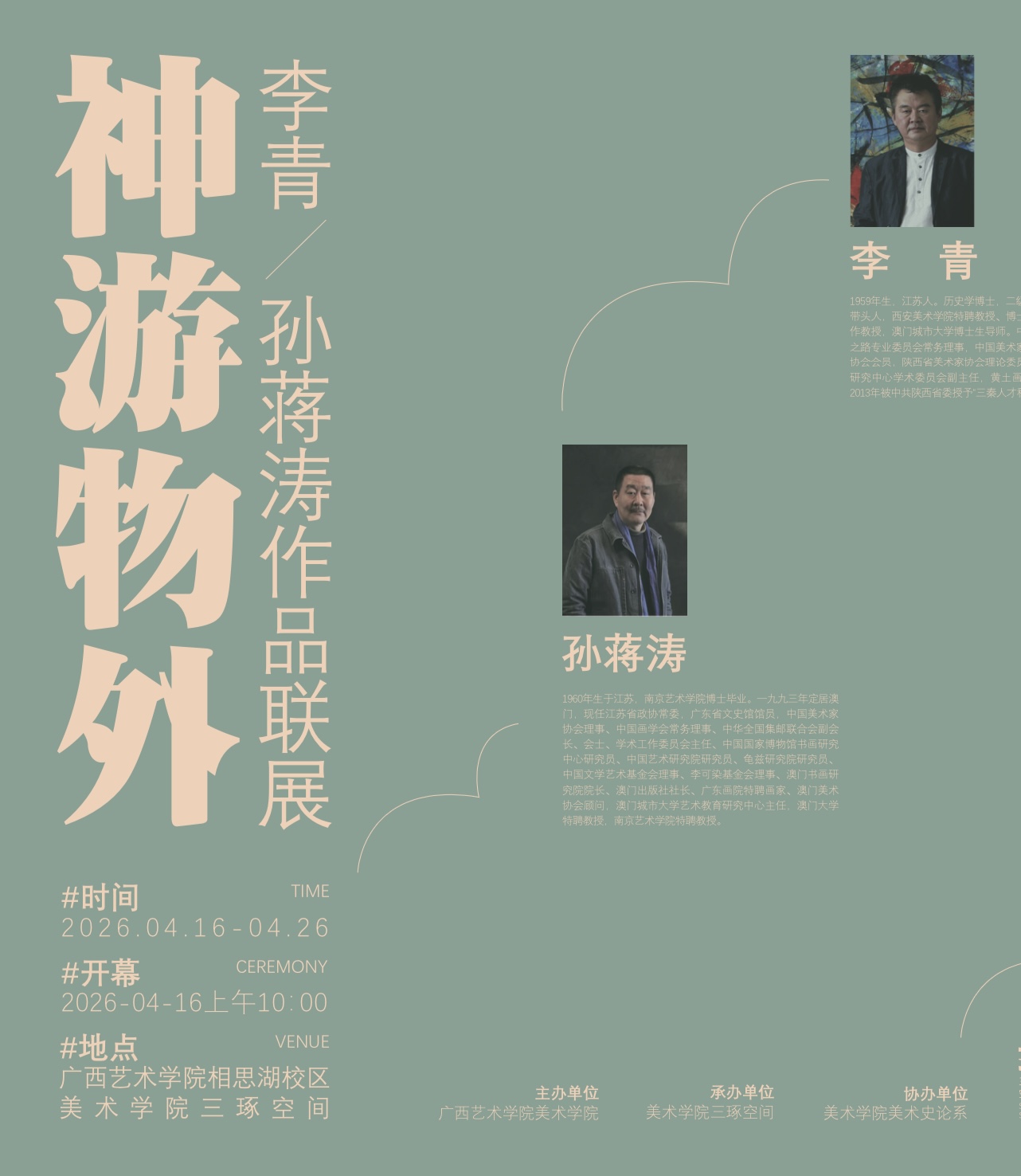 4月16日上午10点,由广西艺术学院美术学院主办的“神游物外--李青、孙蒋涛作品联展”于广西艺术学院美术学院三琢空间美术馆开幕。展览呈现李青综合材料绘画作品、孙蒋涛中国画山水作品共60余幅。